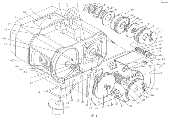 一種節(jié)能安全的微型電動(dòng)葫蘆(圖1)包括具有第一殼腔(47)的主殼體(49)、配置在主殼體(49)一端的具有第二殼腔(52)的第一罩殼(1)、配置在主殼體另一端的具有第三殼腔(53)的第二罩殼(24)和彼此平行地并且以臥置狀態(tài)地設(shè)置在第一殼腔(47)中的滾筒機(jī)構(gòu)(51)和電機(jī)(2),其特征在于:電機(jī)(2)為直流永磁電機(jī);第三殼腔(53)內(nèi)設(shè)置有一用于對(duì)滾筒機(jī)構(gòu)(51)實(shí)施制動(dòng)的并且對(duì)滾筒機(jī)構(gòu)(51)超限吊重作出響應(yīng)的制動(dòng)機(jī)構(gòu)(54),該制動(dòng)機(jī)構(gòu)(54)分別與滾筒機(jī)構(gòu)(51)和電機(jī)(2)傳動(dòng)聯(lián)結(jié)。(北京凌鷹)