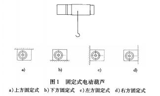 (1)固定式無運(yùn)行機(jī)構(gòu)、固定使用的電動(dòng)葫蘆,按其安裝方式不同(即座腳在上、下、左、右位置的不同)可分圖1所示四種類型。