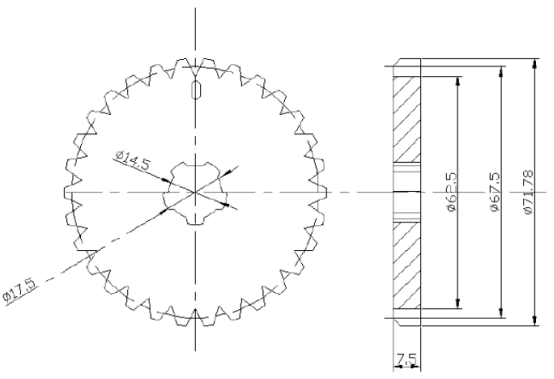 根據(jù)葫蘆傳動齒輪低速重載,根據(jù)手拉葫蘆傳動結構的原理由五尺長軸的小齒輪帶動片齒輪甲、乙,考慮到五尺長軸的小齒輪齒數(shù)甚小等特點,1.5型葫蘆選用了齒形角20°的漸開線特種片齒輪變位齒輪,其基本齒形的基本參數(shù)如圖所示。選用齒形是考慮了以下因素:1.5t葫蘆傳動齒輪的小齒輪齒數(shù)甚少為了避免根切和增強度,只能用正變位切削這樣小齒輪的外圓就受齒條的正切力,片齒輪與短軸屬于過硬配合,片齒輪的中心要設計出與短軸尺寸屬于硬配合的小花鍵孔尺寸如圖所示: