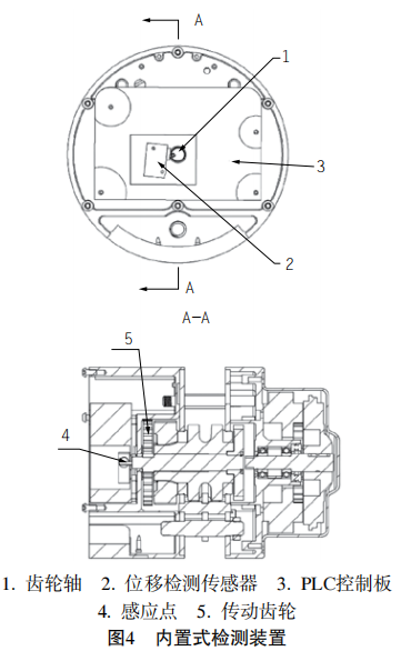 內(nèi)置式高度檢測裝置如圖4所示,它主要由齒輪軸、位移檢測傳感器和PLC控制板組成。齒輪軸位于電動葫蘆內(nèi),齒輪軸貫穿PLC控制板,PLC控制板上設有位移檢測傳感器,位移檢測傳感器位于齒輪軸旁,PLC控制板與位移檢測傳感器電連接,齒輪軸上設有感應點,感應點與位移檢測傳感器配合。根據(jù)不同葫蘆的結(jié)構(gòu),在葫蘆電機的齒輪軸上,布置一個凸起或凹陷的感應開關感應點用于檢測該軸的轉(zhuǎn)動圈數(shù)。電動葫蘆必須配置控制的PLC或單片機,用于處理感應開關檢測到軸的轉(zhuǎn)動圈數(shù)。每臺環(huán)鏈電動葫蘆會根據(jù)實際鏈條長度,預先在程序中設定好鏈條的首位限位點。PLC或單片機程序設定好檢測的軸與起重鏈條運行距離的比例,再根據(jù)檢測軸轉(zhuǎn)動的圈數(shù)計算出鏈條運行的距離,實時計算出吊鉤的高度,當鏈條運行到限位點時會自動停機,起到限位的作用。