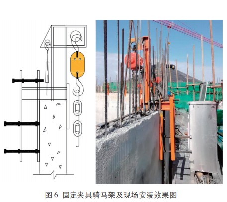 (1)用塔吊將固定夾具騎馬架、電動(dòng)葫蘆吊裝到檐溝操作平臺(tái)作業(yè)面處。固定夾具騎馬架騎扣在倉(cāng)壁鋼牛腿預(yù)埋件的正上方。在每個(gè)固定夾具騎馬架馬頭上掛鉤孔掛 1 個(gè) 6.8T 電動(dòng)葫蘆,本項(xiàng)目共設(shè)計(jì)26個(gè),其數(shù)量依據(jù)為荷載:桁架23.58T+模板、鋼管、扣件、施工荷載 15.78T=39.36T ;電動(dòng)葫蘆起重荷載6.8T,葫蘆荷載減半計(jì)算為3.4T,39.36/26=1.52T,所以選擇 26 個(gè) 6.8T 的電動(dòng)葫蘆足以滿足施工要求(見(jiàn)圖6)。