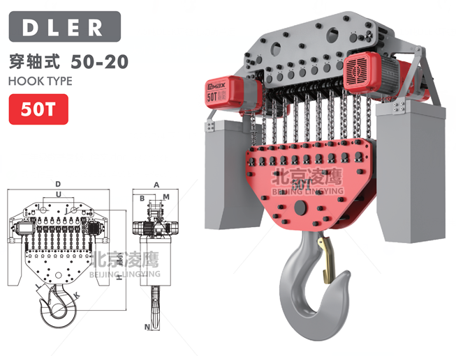50噸DLER環(huán)鏈電動葫蘆穿軸式限位開關(guān):重物吊上吊下都有極限開關(guān)裝置,使電機(jī)自動停止,以防止鏈條超出,確保安全。