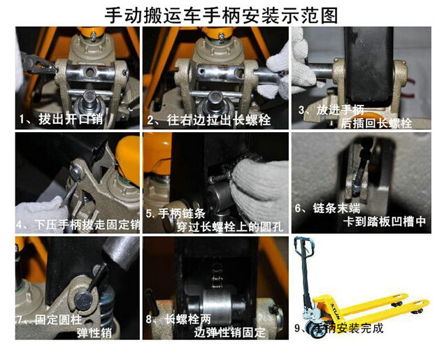 目前,越來(lái)越多的場(chǎng)所都會(huì)看到手動(dòng)搬運(yùn)車的身影,重量輕,容易操作,價(jià)格低,又經(jīng)濟(jì)實(shí)用。特別適用于汽車裝卸及車間、倉(cāng)庫(kù)、碼頭、車站、貨場(chǎng)等地的易燃、易爆和禁火物品的裝卸運(yùn)輸設(shè)備。下面北京凌鷹技術(shù)人員來(lái)教你地牛手柄的安裝,詳情如下: