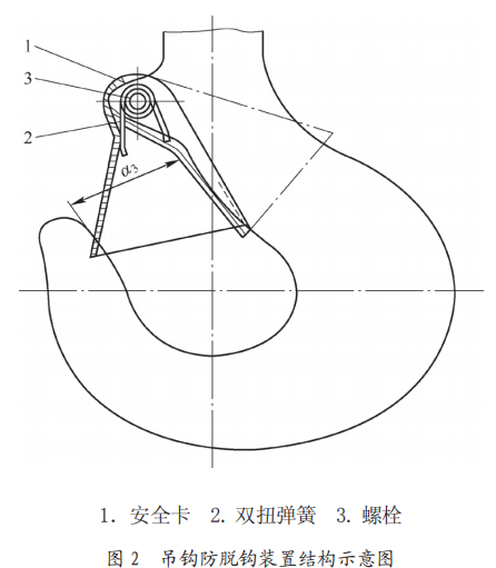 吊鉤防脫鉤裝置:該吊鉤防脫鉤裝置為卡片式結(jié)構(gòu),該裝置由安全卡、雙扭彈簧、螺栓組成,如圖2所示。經(jīng)現(xiàn)場檢查,事發(fā)后安全卡處于吊鉤開口以外非正常工作位置。安全卡長110mm,款39mm,安全卡無明顯變形,雙扭彈簧功能有效,螺栓緊固完好。通過將安全卡恢復(fù)到正常工作位置后手動測試,安全卡動作復(fù)位靈活,防脫鉤裝置具備正常防脫鉤功能。