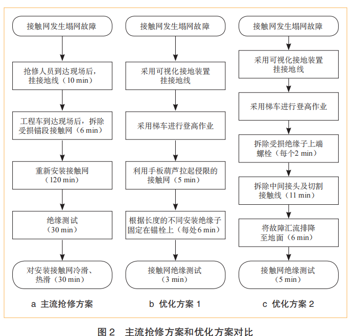 對比主流搶修方案和優(yōu)化后的2種不同的方案,如圖2所示。方案1:假設(shè)發(fā)生接觸網(wǎng)塌網(wǎng)故障,定位化學錨栓未脫落時,接觸網(wǎng)未斷裂,將侵限的接觸網(wǎng)利用手扳葫蘆拉起。再次固定到懸掛定位上,保證不侵入車輛限界;方案2:接觸網(wǎng)塌網(wǎng)故障造成接觸網(wǎng)斷裂,將故障變形的接觸網(wǎng)進行切除。