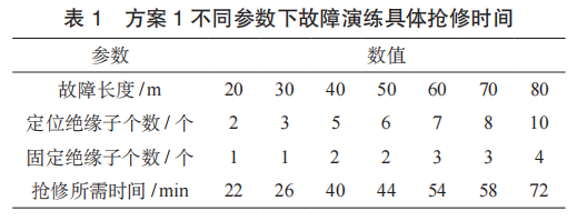 根據(jù)接觸網(wǎng)塌網(wǎng)故障長度的不同,以及定位和固定絕緣子個數(shù)的不同,方案1故障演練具體搶修時間見表1,處理完畢后經(jīng)判斷具備送電條件后即可送電,列車限速通過。