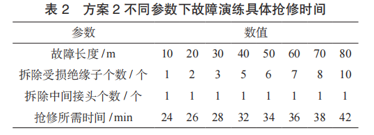 根據(jù)接觸網(wǎng)受損長度的不同,處理的時長也不同,方案2故障演練具體搶修時間見表2,將該段接觸網(wǎng)拆除后經(jīng)判斷具備送電條件后電調(diào)送電,車輛在通過該區(qū)域時,必須降弓通過,否則會造成二次故障。