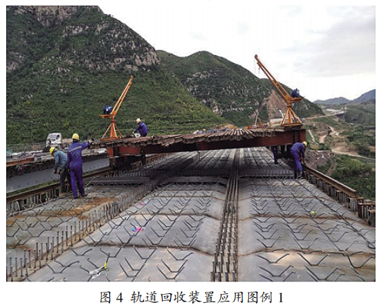 該軌道回收裝置用于鋼混橋梁架橋機(jī)架設(shè)完畢后,架橋機(jī)的軌道回收,利用旋轉(zhuǎn)中心軸、第一旋轉(zhuǎn)托盤和第二旋轉(zhuǎn)托盤可實(shí)現(xiàn)吊具的360毅旋轉(zhuǎn)作業(yè),作業(yè)方便快捷,使用安全可靠,操作易控制,自重輕、施工快速,避免了物品回收時(shí)的人工轉(zhuǎn)運(yùn)時(shí)耗,有利于施工成 本的節(jié)約?;喌蹉^裝置通過(guò)定滑輪、起吊電動(dòng)葫蘆和 鋼絲繩作用,可實(shí)現(xiàn)架橋機(jī)軌道的高效回收。與現(xiàn)有技術(shù)相比,該應(yīng)用于鋼混橋梁安裝架橋機(jī) 軌道回收裝置的設(shè)計(jì)結(jié)構(gòu)簡(jiǎn)單、使用方便快捷、安全可靠、易控制和成本低,采用該回收裝置規(guī)避了傳統(tǒng)人工進(jìn)行軌道回收的耗時(shí)且效率低下問題;提升了架橋機(jī)軌道回收的效率;規(guī)避了人工回收軌道的安全隱患;快捷方便且縮短了鋼混橋梁的架設(shè)工期。