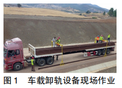 從設(shè)備的耐用性出發(fā),設(shè)備需要結(jié)構(gòu)簡(jiǎn)單,操作簡(jiǎn)單,維修方便,制作維護(hù)成本低,從設(shè)備的安全性出發(fā),設(shè)備需要滿足長(zhǎng)途運(yùn)輸過程中自身不脫落車體,并且滿足在裝卸鋼軌過程中的承重能力達(dá)到要求,從設(shè)備的快速機(jī)動(dòng)性出發(fā),起重裝置需采用電力驅(qū)動(dòng),以提升起重升降的效率。另外設(shè)備的運(yùn)行狀態(tài)需 要針對(duì)鋼軌運(yùn)輸過程中的各種狀態(tài)快速切換,如在基 地裝車鋼軌時(shí)不能影響大型龍門吊作業(yè),運(yùn)至現(xiàn)場(chǎng)后 快速切換至卸軌作業(yè)狀態(tài),作業(yè)狀態(tài)中卸軌后行進(jìn)至下一卸軌里程點(diǎn)的短程行進(jìn)狀態(tài)與裝卸狀態(tài)能夠快速切換,根據(jù)上述需求,從實(shí)際情況出發(fā),項(xiàng)目所使用的運(yùn)軌設(shè)備是兩臺(tái)國(guó)內(nèi)采購(gòu)的可伸縮平板車,縮合狀態(tài)時(shí)長(zhǎng)度為12m可用于運(yùn)送軌枕,最大伸長(zhǎng)狀態(tài)時(shí)長(zhǎng)度為18m 用于運(yùn)送鋼軌,則需要將卸軌設(shè)備與平板車結(jié)合起來(lái)。參照已有的大型龍門架,可以在平板車上設(shè)計(jì)一 個(gè)縮小版的門架式體系,平板車頂面兩側(cè)設(shè)有數(shù)個(gè)插槽,原本是為防止運(yùn)輸中鋼軌脫落放置立柱使用,現(xiàn)可借助該立柱,輔以一根橫梁以及一根立于地面的支柱,形成一個(gè)門架式體系,門架式體系形成后,模仿基地裝卸鋼軌的大型龍門吊,在橫梁上安裝一個(gè)可以滑動(dòng)的電動(dòng)葫蘆,在車尾處安裝一臺(tái)發(fā)電機(jī)以提供動(dòng)力。在鋼軌上選取兩個(gè)吊點(diǎn)設(shè)置兩組門架體系,使用裝在橫梁上電動(dòng)葫蘆的夾具,即可成功達(dá)到裝卸鋼軌的目的,如圖1所示。