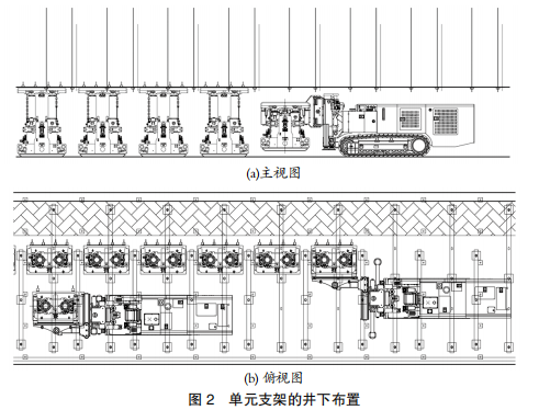 在沿空留巷工作面,單元支架通常布置在工作面后部,可以給脫模后墻體提供臨時保護,能夠保證在墻體凝固到一定強度前不承接頂板壓力。為防止反復(fù)撐頂破壞頂板,單元支架的移動采用無反復(fù)支撐的方式。撤除時,采用專用搬運車將最后面的支架移至最前面,保證留巷頂板完好。單元支架在井下工作面的布置如圖 2 所示。